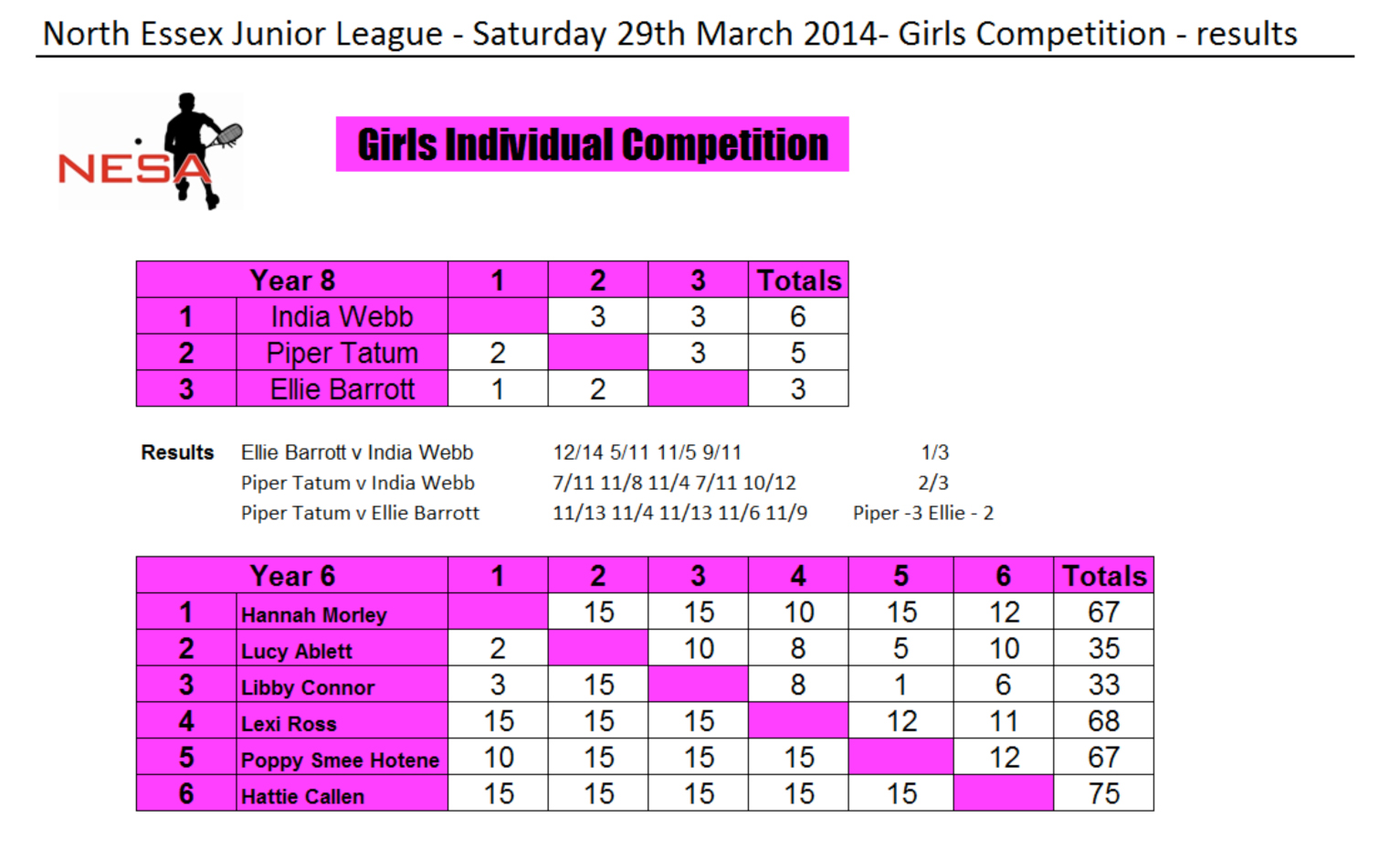 NEJL Girls Competition - results Saturday 29th March 2014